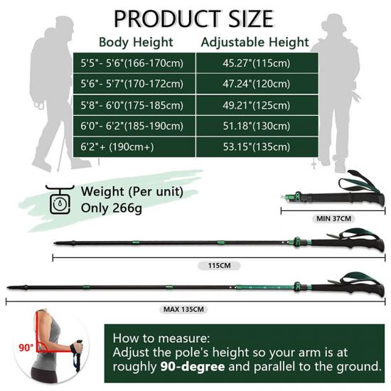 ไม้เท้าเดินป่ารุ่นนี้ใช้ระบบล็อคแบบผสมผสานร่วมกับระบบล็อคแบบเร็วและล็อคแบบบิด และมีสปริงป้องกันการกระแทกในตัวบริเวณล็อคแบบบิด ดังนั้นความเสียหายจะส่งผลกระทบต่อคุณน้อยลง คุณสามารถเคลื่อนที่ได้เร็วขึ้นและเร็วขึ้นในขณะที่ใช้พลังงานด้วย ไม้เท้าช่วยเดินแบบปรับได้เหมาะสำหรับคนส่วนใหญ่ นอกจากนี้ ไม้ค้ำสำหรับการเทรคกิ้งที่มีขั้นชัดเจนและปลายหยุดที่ขยายได้ตั้งแต่ 25" ถึง 53" ยังเล็กและเบาที่สุดเท่าที่จะเป็นไปได้ เหมาะสำหรับทุกความสูง ตั้งแต่เตี้ยไปจนถึงสูง ผู้ชาย ผู้หญิง และแม้แต่เด็ก! ระวังอย่าให้เกินมัน
