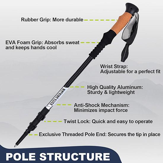 น้ำหนักเบา: แต่ละอัน เดินป่าอลูมิเนียม ขั้วโลกมีน้ำหนักเพียง 294g (10.4oz), ทำให้เหมาะสำหรับการแบกเป้เป็นอ้อยทั้งหมดดาy.
