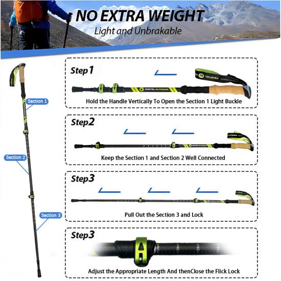 [ขนาดกะทัดรัดและเป็นมิตรกับการเดินทาง ไม้เท้าเดินป่า [ขนาดกะทัดรัดและเป็นมิตรกับการเดินทาง สามารถจัดเก็บในกระเป๋าเดินทางได้อย่างง่ายดาย, กระเป๋าเป้สะพายหลังและกระเป๋าสัมภาระ. ไม้เท้าเดินป่ารุ่นนี้ยังมาพร้อมกับอุปกรณ์ป้องกันปลายยางที่จัดเก็บง่าย, ขั้วต่อขั้วและตะกร้าโคลน. [รุ่นใหม่และปรับปรุง! ไม้ค้ำสำหรับการเทรคกิ้งเพื่อการเทรคกิ้งมาพร้อมสายรัดบุนวมเพื่อความสบายสูงสุดและการยึดเกาะตามหลักสรีรศาสตร์. ไม่ต้องกังวลว่าเสาเทรคกิ้งจะตกลงมาอีก.