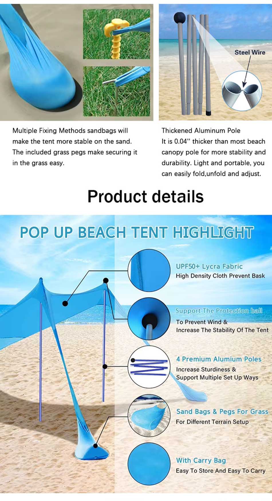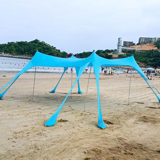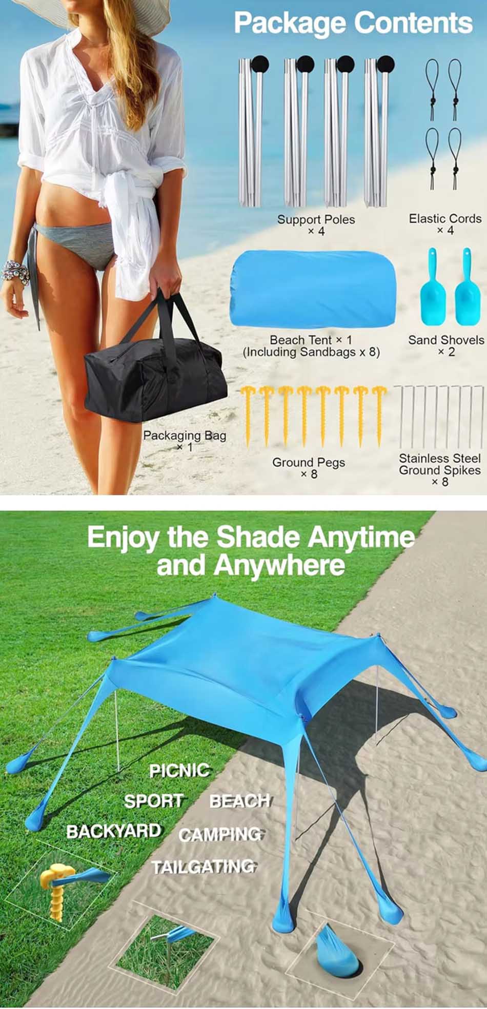 เต็นท์บังแดดสำหรับตั้งแคมป์ กันสาดชายหาดป้องกันรังสียูวี เป็นอุปกรณ์เสริมอเนกประสงค์ที่จำเป็นสำหรับการผจญภัยกลางแจ้ง มอบการปกป้องแสงแดดและความสบายที่เชื่อถือได้ ผลิตจากผ้าคุณภาพสูงที่ทนทานต่อรังสียูวี ช่วยป้องกันแสงแดดที่เป็นอันตราย มอบพื้นที่พักผ่อนที่ปลอดภัยและร่มรื่น ดีไซน์น้ำหนักเบาและพับเก็บได้ ช่วยให้ติดตั้ง จัดเก็บ และพกพาสะดวก เหมาะสำหรับการออกไปพักผ่อนที่ชายหาด ตั้งแคมป์ ปิกนิก และสังสรรค์ในสวนหลังบ้าน เสาค้ำและกระสอบทรายที่ทนทานช่วยให้มั่นคงแม้ในสภาพอากาศที่มีลมแรง พื้นที่ใต้เต็นท์กว้างขวางรองรับคนหรืออุปกรณ์ได้หลายคน ระบายอากาศได้ดีและสะดวกสบาย ไม่ว่าคุณจะอยู่ที่ชายหาดหรือที่ตั้งแคมป์ เต็นท์บังแดดนี้เป็นสิ่งจำเป็นสำหรับการรักษาความเย็น การปกป้อง และความสบายในระหว่างกิจกรรมกลางแจ้งที่มีแดดจ้า