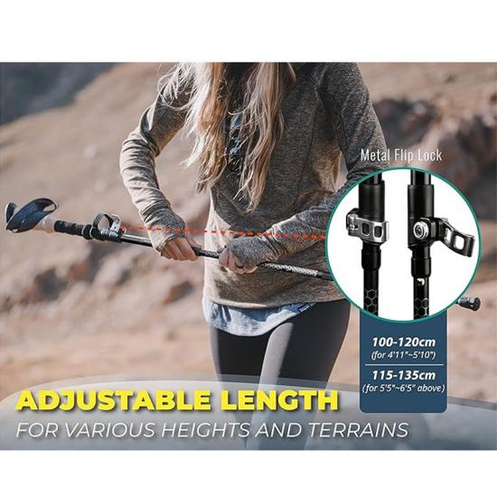 ไม้เท้าเดินป่ารุ่นนี้ใช้ระบบล็อคแบบผสมผสานร่วมกับระบบล็อคด่วนและล็อคแบบบิด และมีสปริงป้องกันการกระแทกในบริเวณล็อคแบบบิด ดังนั้นความเสียหายจะส่งผลกระทบต่อคุณน้อยลง คุณสามารถเคลื่อนที่ได้เร็วขึ้นและเร็วขึ้นในขณะที่ใช้พลังงาน