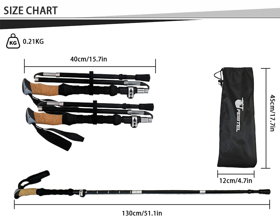 ไม้เท้าเดินป่าแบบพับได้ ผลิตจากอลูมิเนียมอัลลอยด์ 7075 คุณภาพสูง มีความแข็งแรง น้ำหนักเบา และทนทาน มาพร้อมระบบปรับความสูงได้ ช่วยให้นักเดินป่าสามารถปรับไม้เท้าให้เหมาะสมกับสรีระเพื่อความสบายและการรองรับที่ดีที่สุดบนพื้นผิวต่างๆ ด้ามจับทำจากไม้ก๊อกออกแบบตามหลักสรีรศาสตร์ ให้การจับที่นุ่มนวล ทนต่อเหงื่อ และช่วยเพิ่มความมั่นคงระหว่างการเดินป่าระยะยาว ลดความเมื่อยล้าของมือ และเพิ่มการควบคุมโดยรวม โครงสร้างแบบพับได้ช่วยให้กางใช้งานได้รวดเร็วและจัดเก็บได้ง่ายในกระเป๋าเป้หรือกระเป๋าเดินทาง ทำให้ไม้เท้าเดินป่าเหล่านี้เหมาะสำหรับการเดินป่า ปีนเขา แบกเป้ และการเดินในชีวิตประจำวัน โดยเฉพาะอย่างยิ่งสำหรับผู้ที่ชื่นชอบกิจกรรมกลางแจ้งที่ต้องการประสิทธิภาพที่เชื่อถือได้ ความอเนกประสงค์ และโครงสร้างที่ทนทานสำหรับการผจญภัยในป่า ภูเขา อุทยาน และสภาพแวดล้อมการเดินทางที่ทุรกันดาร
