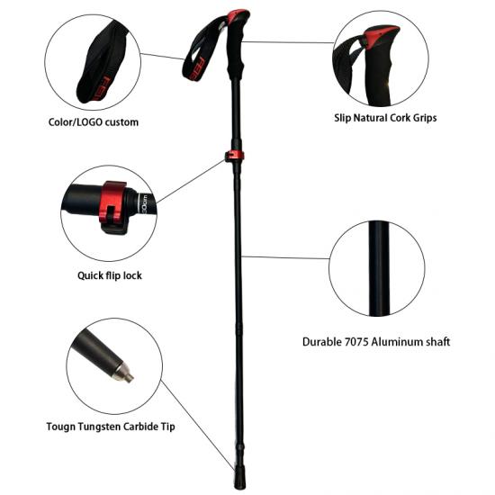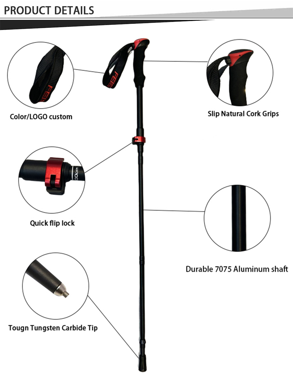 feistel ขายส่งอลูมิเนียมอัลลอยด์ไม้ก๊อก EVA จับล็อคอย่างรวดเร็วพับเสาเดินป่า