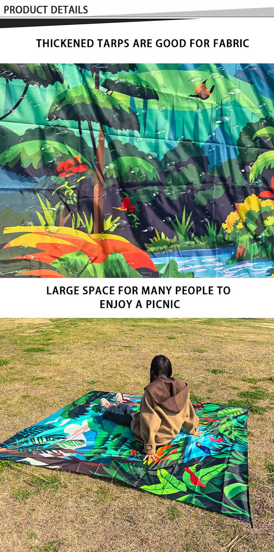 ผลิตภัณฑ์ - เสื่อปิกนิกกันน้ำขนาดใหญ่ผืนนี้เหมาะสำหรับการเดินป่า ตั้งแคมป์ หรือใช้ที่ชายหาด ด้วยวัสดุที่ทนทานและตัวเลือกการพิมพ์ที่กำหนดเองสำหรับความสะดวกสบายและมีสไตล์กลางแจ้ง
