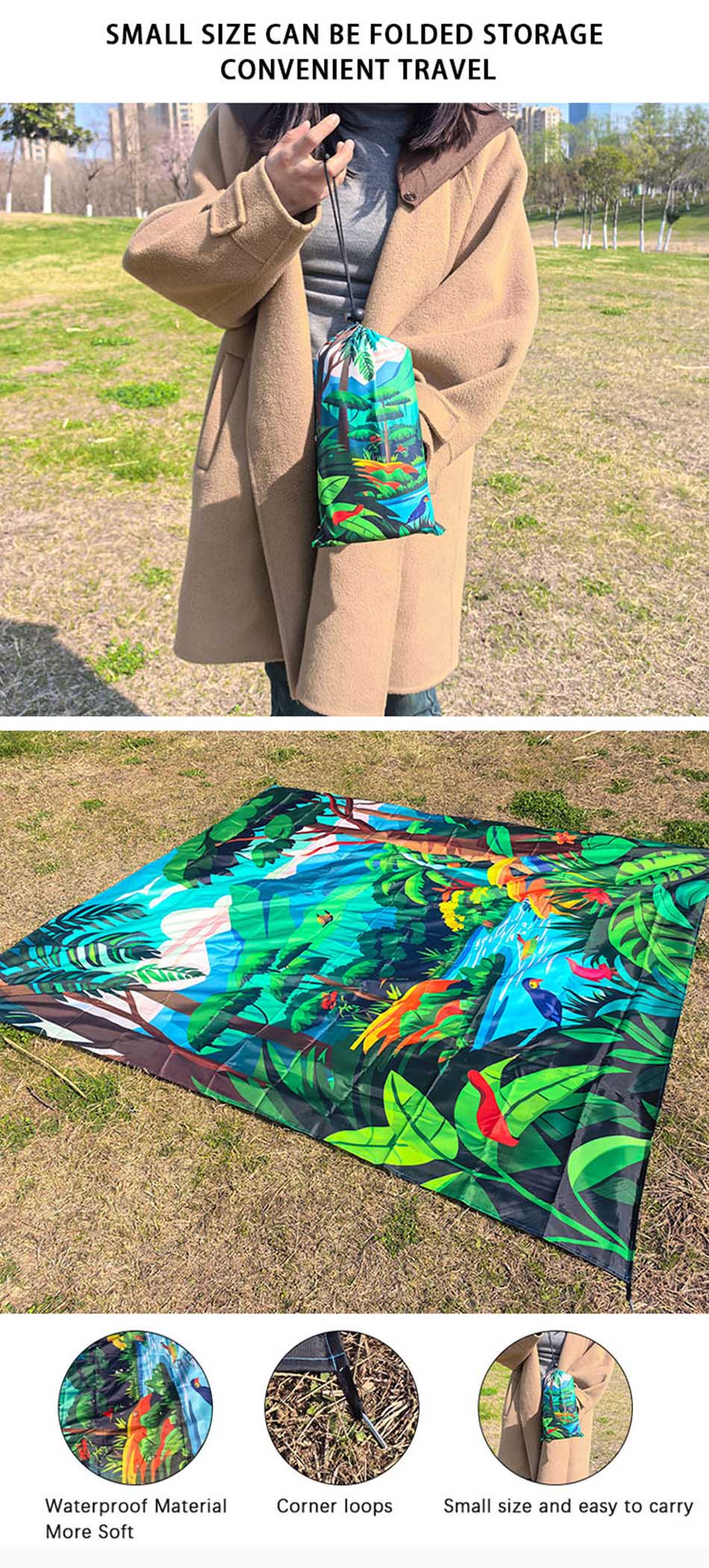 ผ้าห่มปิกนิกขยายเป็น 200*200ซม. และใหญ่พอที่จะนั่งผู้ใหญ่ 6-8 คนหรือนอนสำหรับผู้ใหญ่ 4 คนได้, ยังมีเสื่อปิกนิกให้ พื้นที่กว้างขวางให้เด็กๆ และสัตว์เลี้ยงวิ่งเล่น