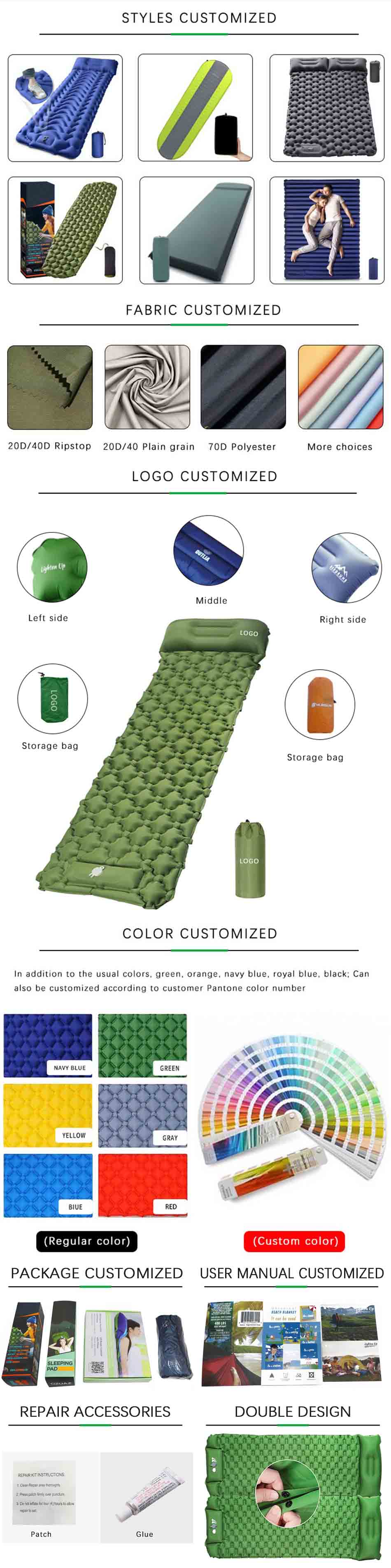 แบรนด์: โรงงาน ANHUI FEISTEL เกี่ยวข้องกับการผลิต: OEM และ ODM สินค้า:เสื่อนอนคู่แบบพกพาพร้อมหมอนเป่าลมในตัว พองตัวได้ง่าย น้ำหนักเบา กะทัดรัด เหมาะสำหรับการตั้งแคมป์ เดินป่า และแบกเป้
