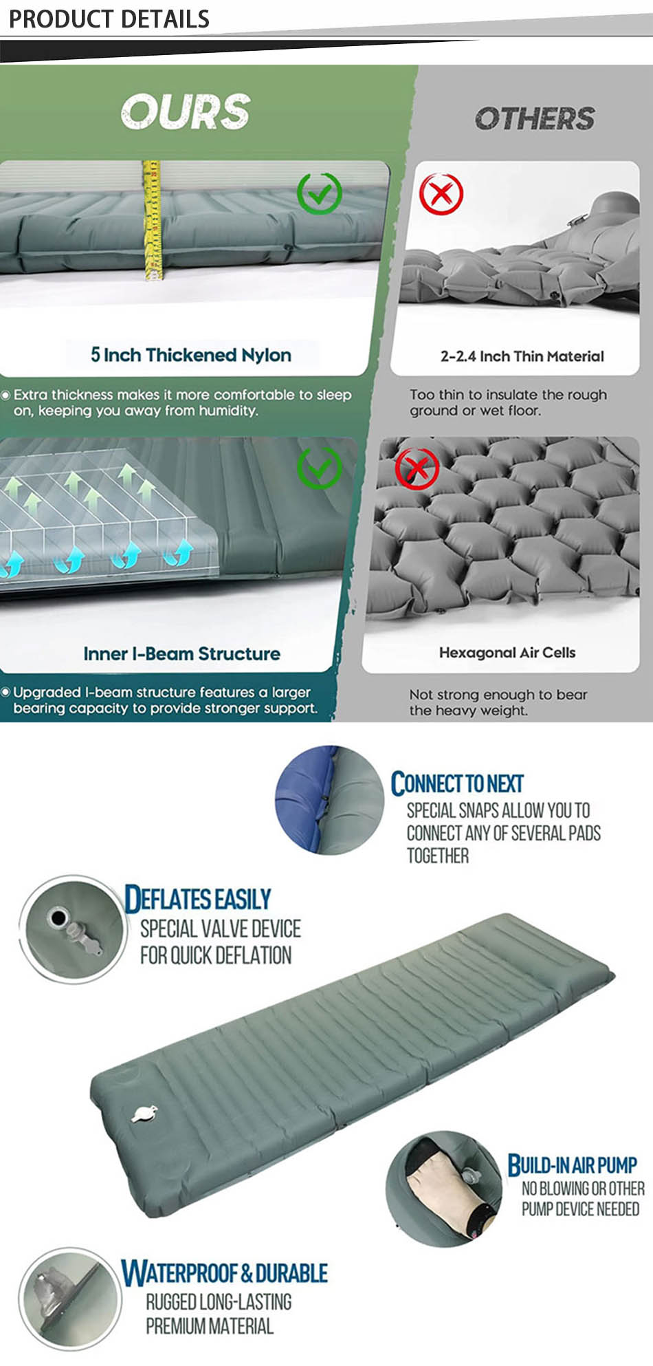1.ผลิตจากวัสดุที่ทนทานและมีคุณภาพสูง -40D nylon เสื่อตั้งแคมป์ สำหรับกลางแจ้ง. 2. ทนทาน 2'' เสื่อตั้งแคมป์หนา มีความทนทานต่อการสึกหรอดีเยี่ยม.