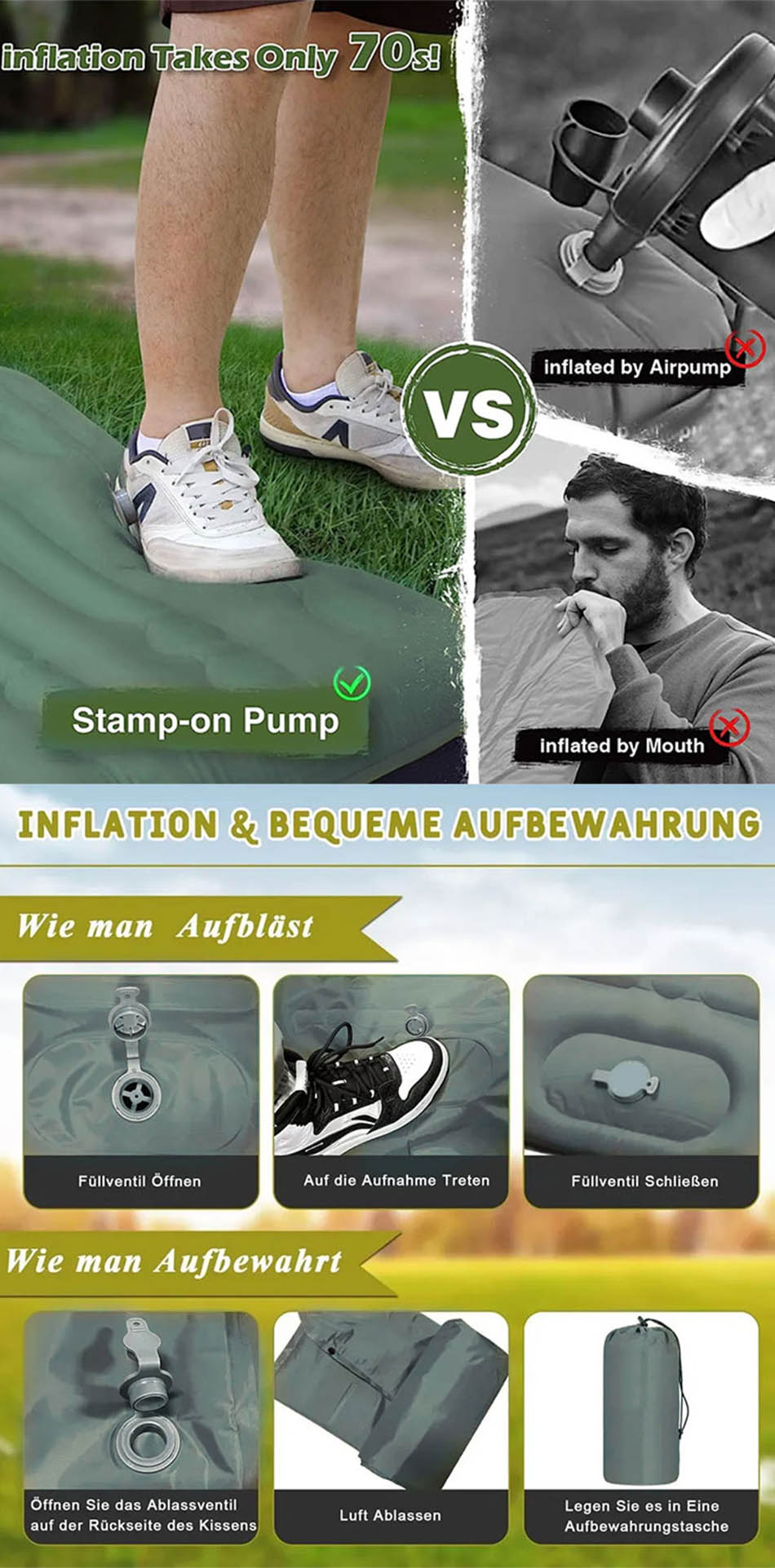 หมอนหนุนนอนหนา: อยากนอนสบายทุกที่? เสื่อแคมป์ปิ้งแบบพกพาระดับพรีเมียมนี้สมบูรณ์แบบ ทนทานและสบายมาก-เหมาะสำหรับทุกตำแหน่งการนอน! น้ำหนักเบาและพกพา-แบกเป้: แผ่นรองนอนที่สมบูรณ์แบบสำหรับการเดินทางของคุณ! แผ่นรองนอนน้ำหนักเบาเป็นพิเศษและพกพาได้นี้เหมาะกับกระเป๋าเป้ทุกแบบและไม่ 'ไม่ปวดหลัง. พกพาสะดวกมาก และมาพร้อมกับกระเป๋าเก็บของสุดเก๋.