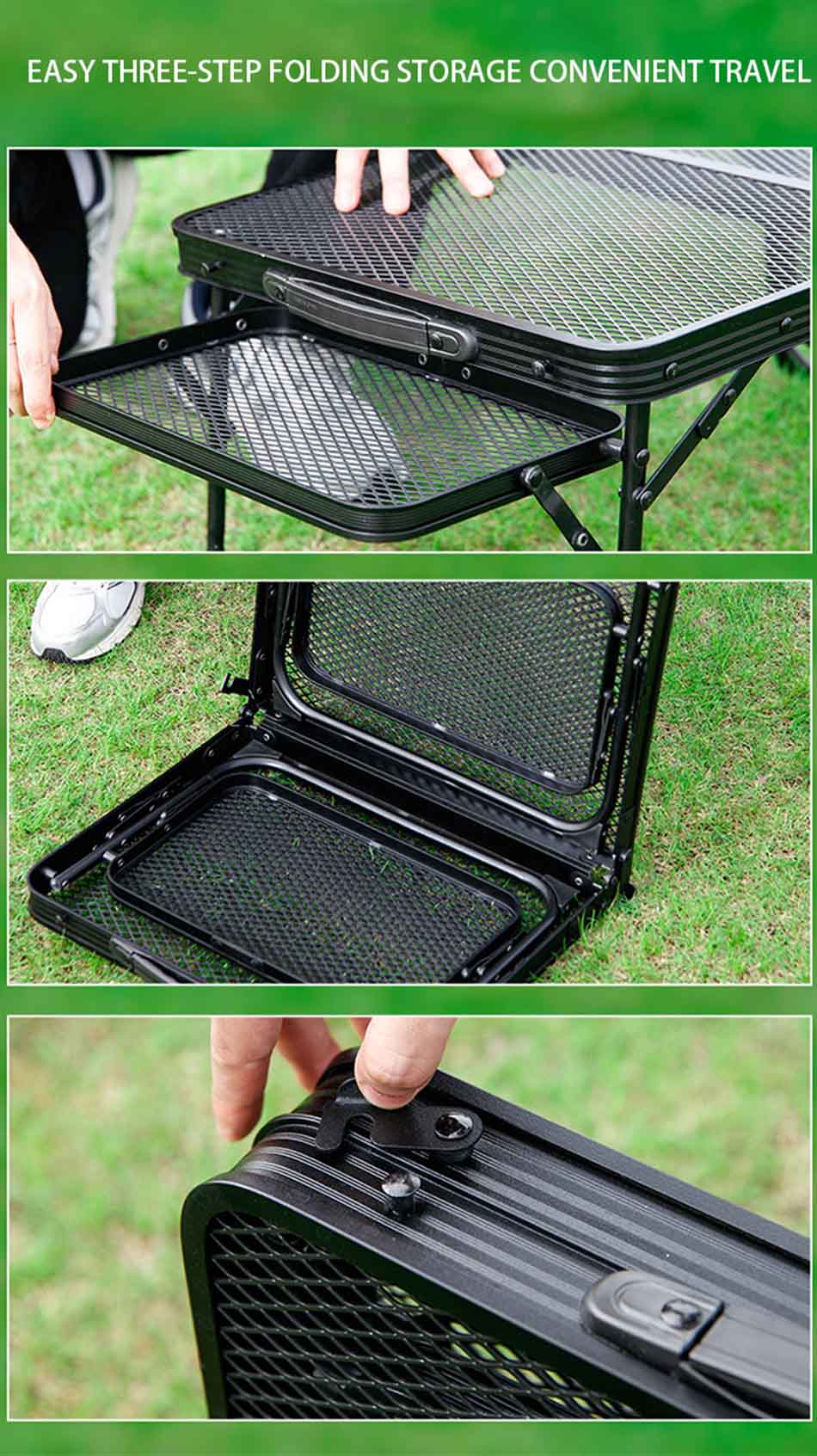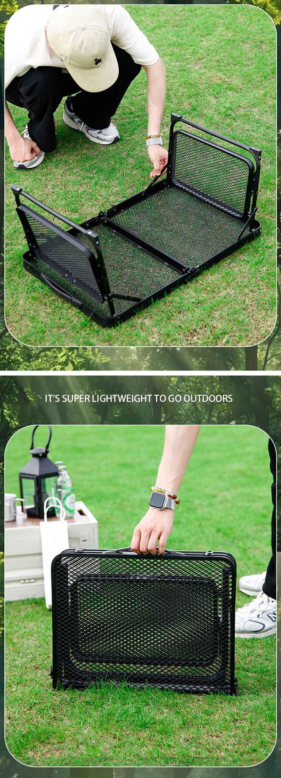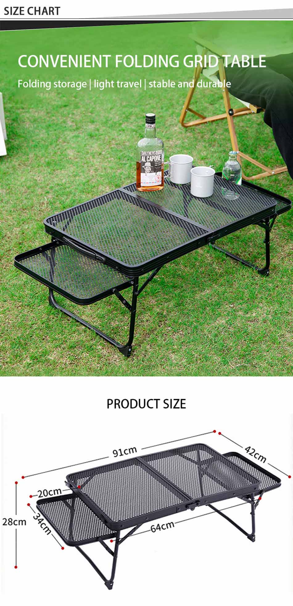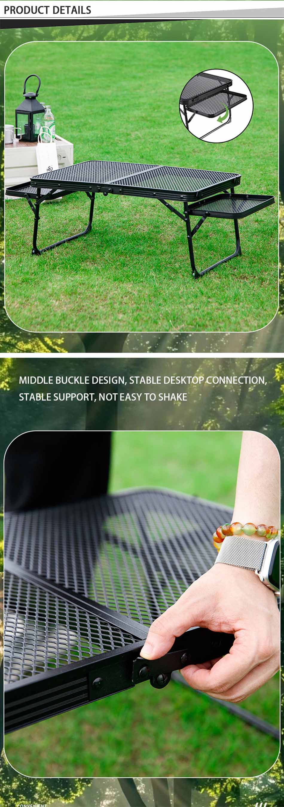 ผลิตภัณฑ์ - โต๊ะพับกลางแจ้งตาข่ายโลหะสำหรับตั้งแคมป์ยุคใหม่มีโครงเหล็กน้ำหนักเบา พื้นผิวตาข่ายทนทาน พกพาสะดวก และมั่นคง เหมาะสำหรับการปิ้งย่าง ปิกนิก และการผจญภัยกลางแจ้ง