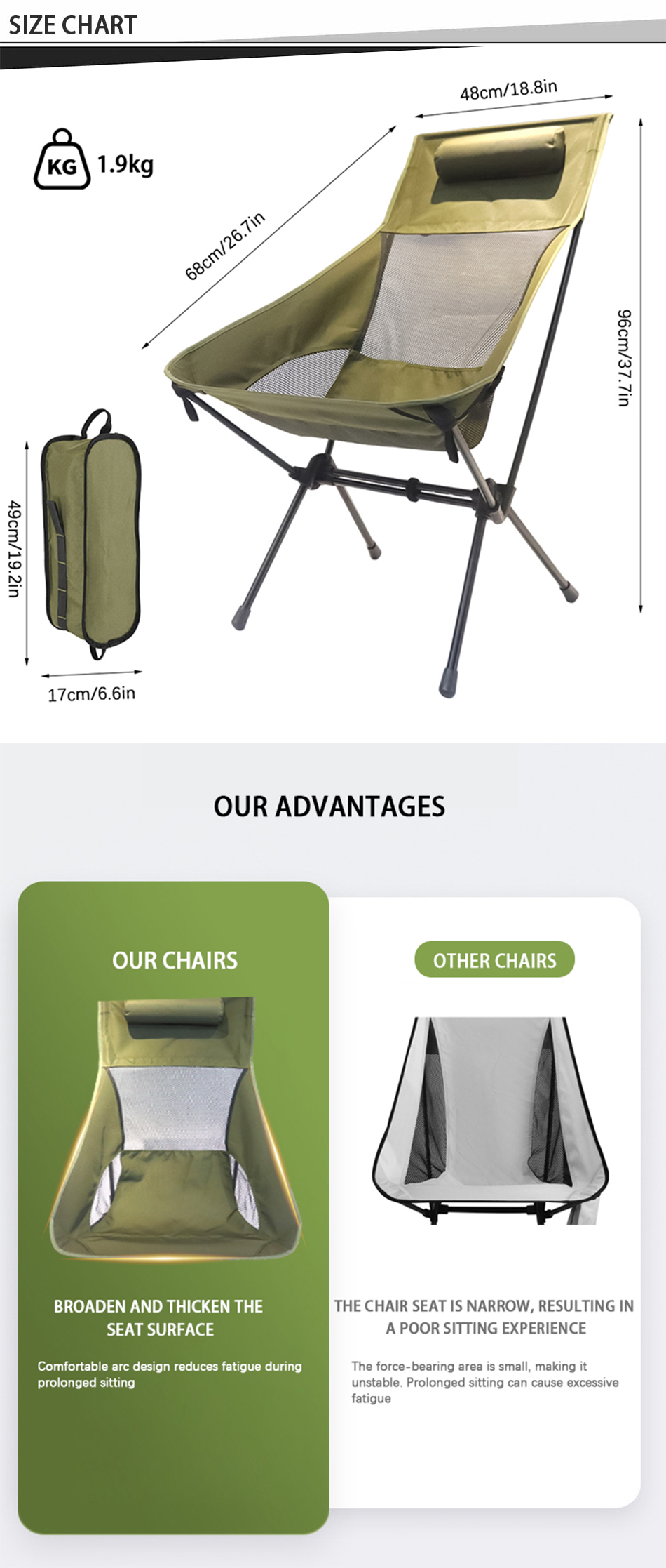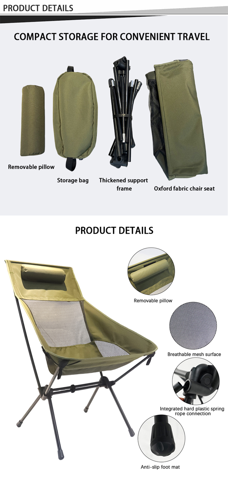 แบรนด์ : โรงงาน ANHUI FEISTEL เกี่ยวข้องกับการผลิต: OEM และ ODM สินค้า:เก้าอี้แคมป์น้ำหนักเบาแบบพนักพิงสูงพร้อมกระเป๋าพกพา เหมาะสำหรับการผจญภัยกลางแจ้ง ให้ความสะดวกสบาย ความทนทาน และพกพาสะดวก