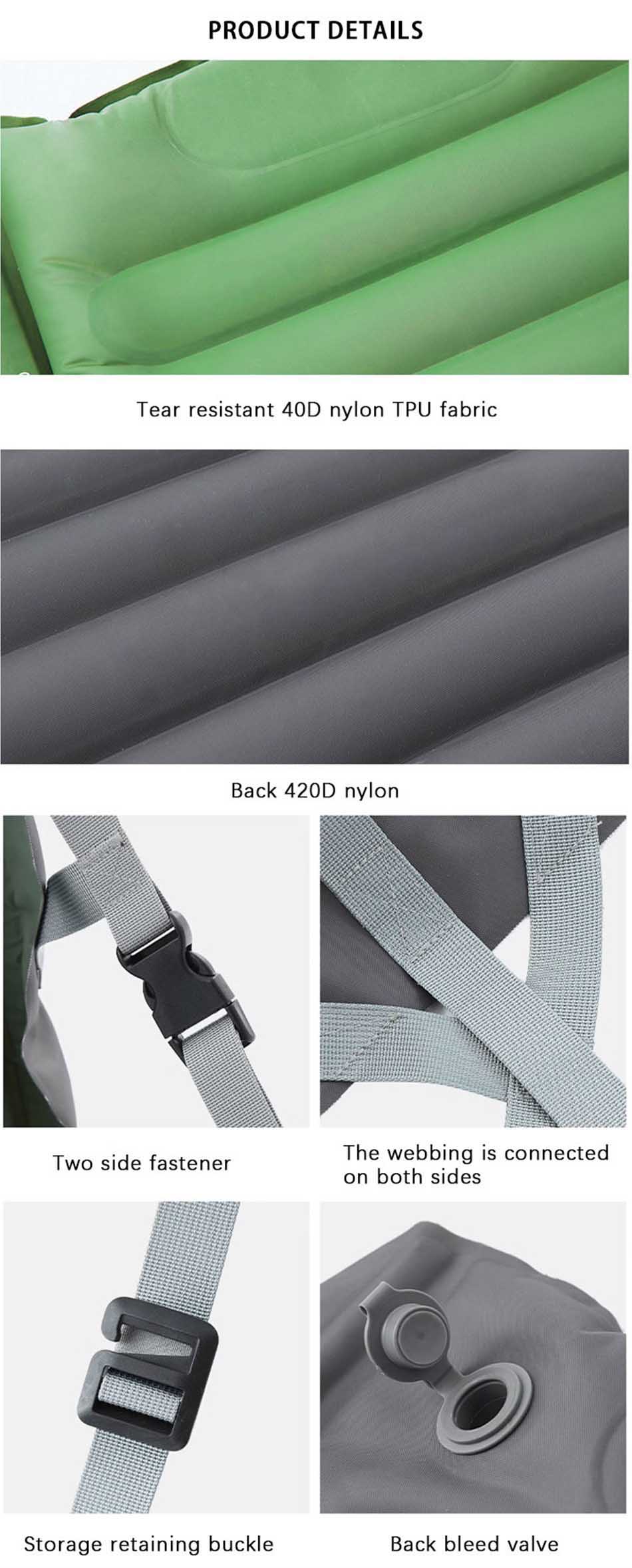 1.ผลิตจากวัสดุที่ทนทานและมีคุณภาพสูง -40D nylon เสื่อตั้งแคมป์ สำหรับกลางแจ้ง. 2. ทนทาน 2'' เสื่อตั้งแคมป์หนา มีความทนทานต่อการสึกหรอดีเยี่ยม.