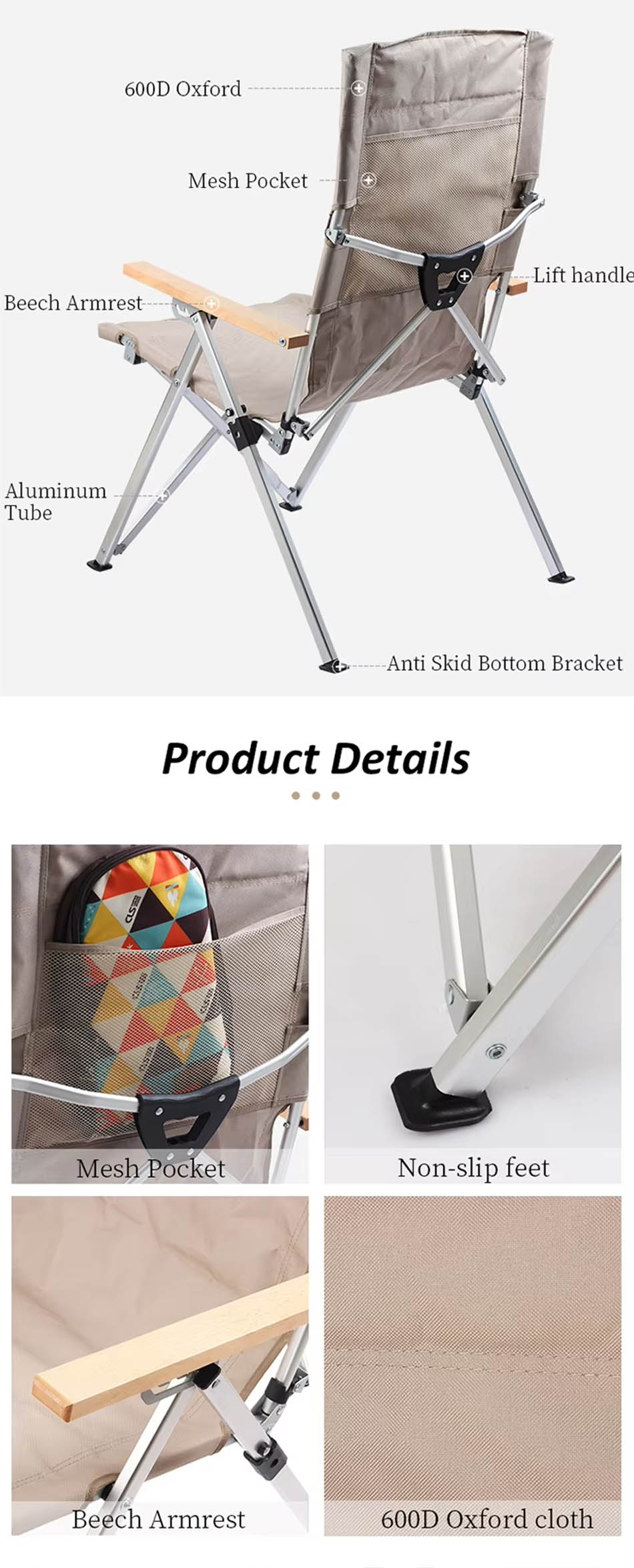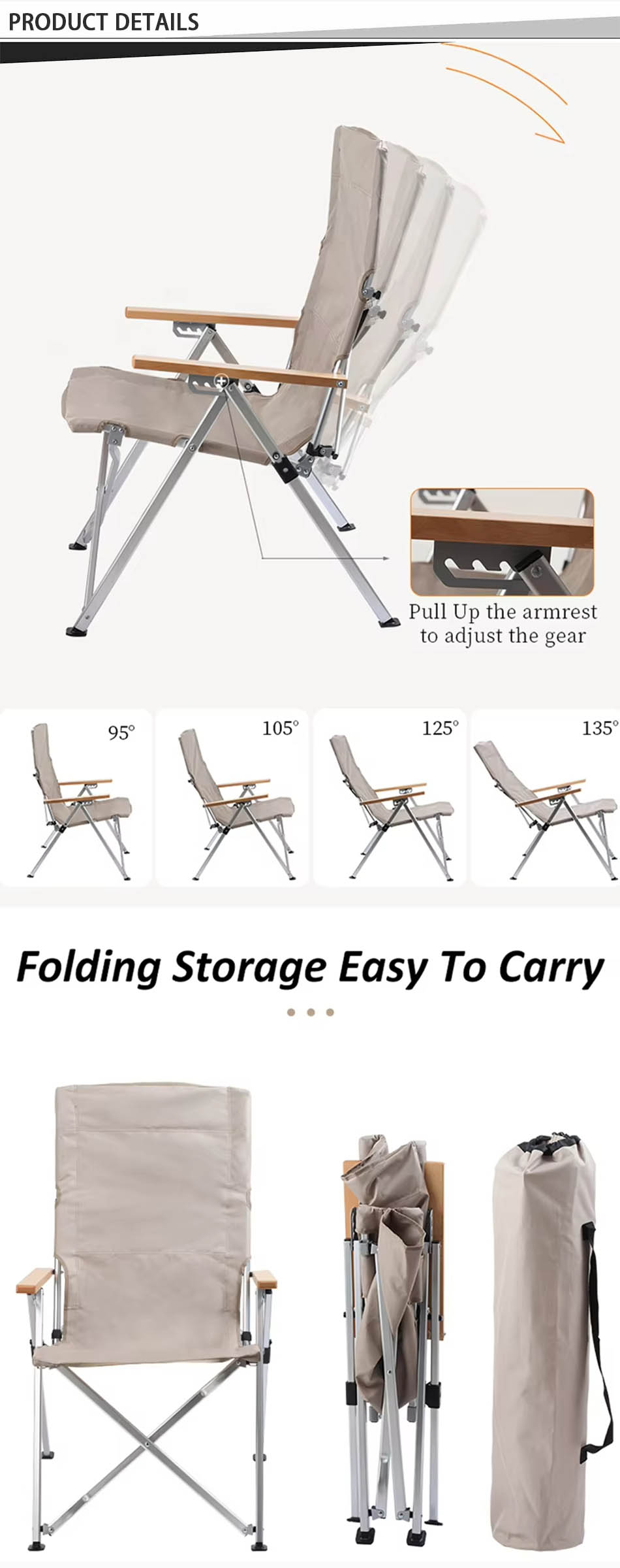 ยี่ห้อ - โรงงาน ANHUI FEISTEL การผลิตที่เกี่ยวข้อง - โออีเอ็ม และ โอดีเอ็ม ผลิตภัณฑ์ - เก้าอี้พับสำหรับตั้งแคมป์กลางแจ้งโครงอลูมิเนียมนี้มีพนักพิงที่ปรับได้ มีน้ำหนักเบาแต่แข็งแรง ให้ความสบายในการพกพาไปตั้งแคมป์ ทริปชายหาด ปิกนิก และพักผ่อนกลางแจ้ง