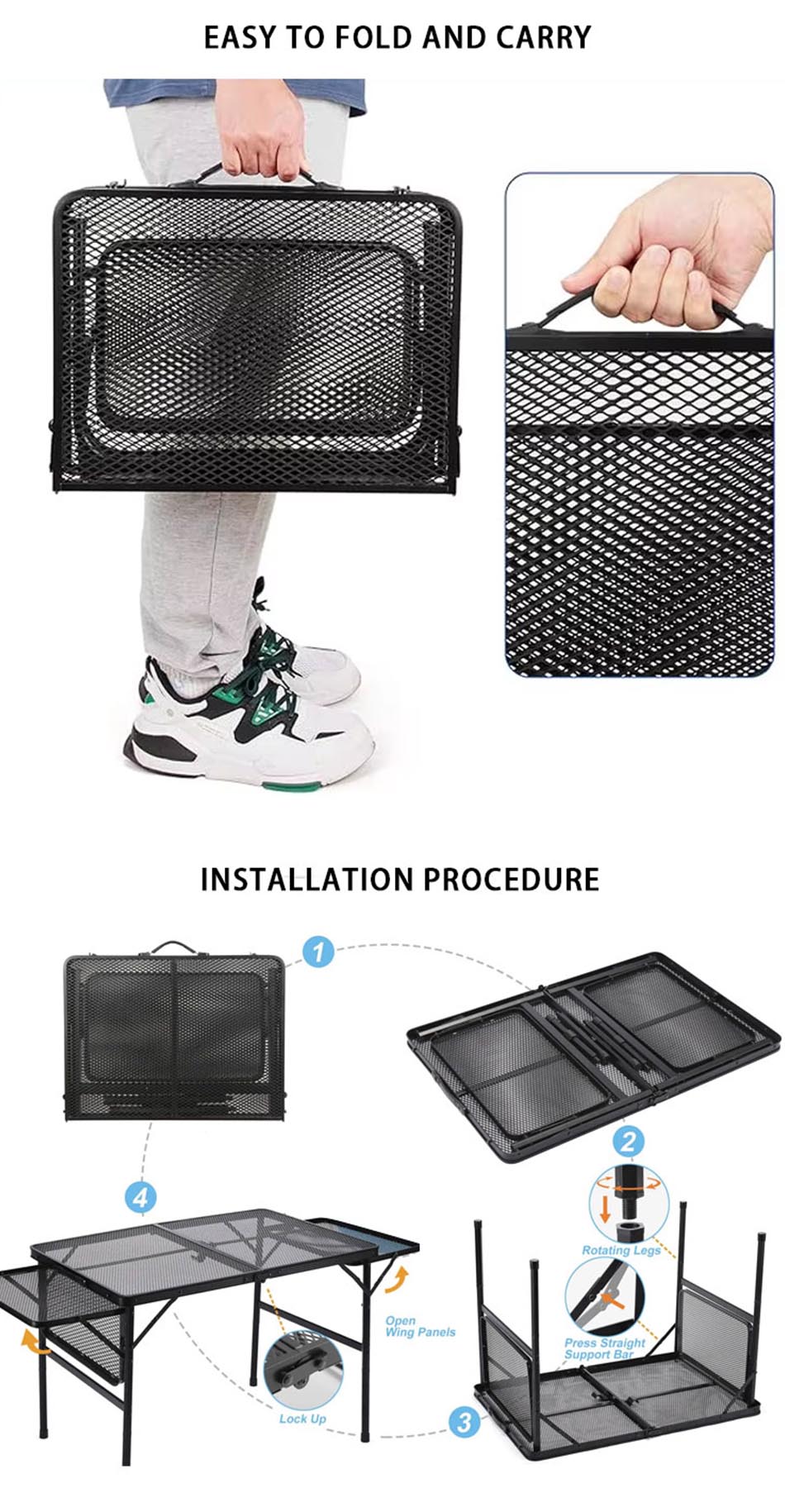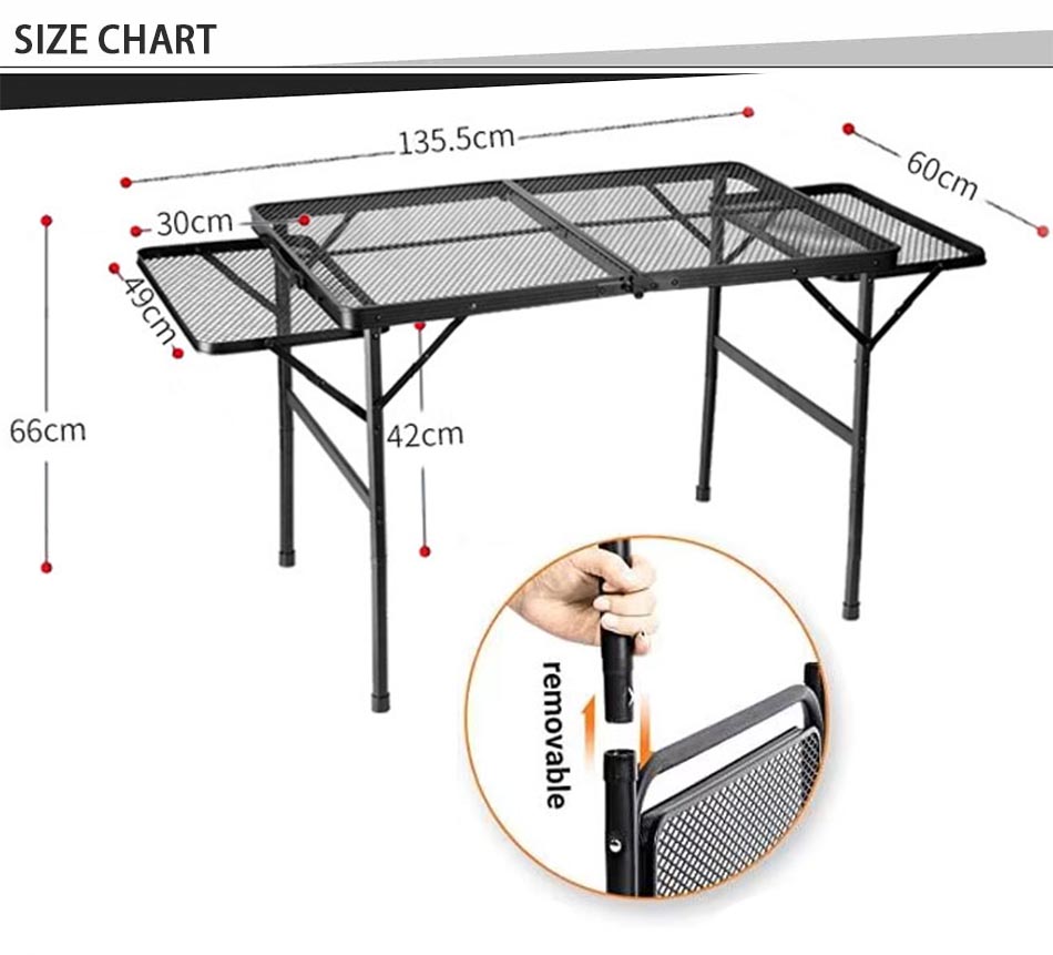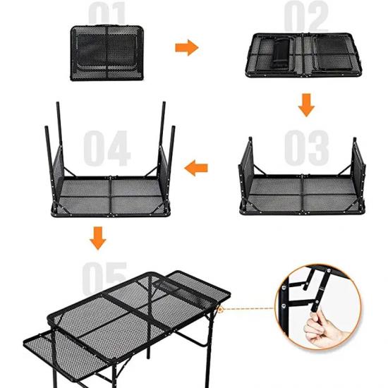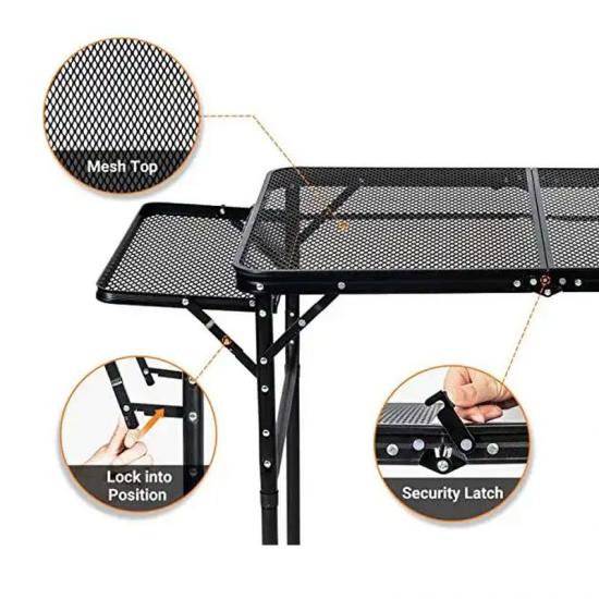 ผลิตภัณฑ์ : โต๊ะปิกนิกกลางแจ้งพับตารางตะแกรงโลหะมีสองชั้นวางด้านข้างนำเสนอความมั่นคงความทนทานและความสะดวกสบายสำหรับการตั้งแคมป์ของครอบครัวการทำอาหารกลางแจ้งและการชุมนุมบาร์บีคิว
