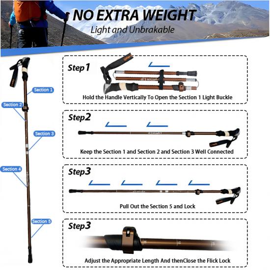ผลิตภัณฑ์ : ไม้เท้าเดินป่าพับได้ 5 ท่อน ผลิตจากอลูมิเนียมอัลลอยด์ 6061 น้ำหนักเบาพิเศษ ให้ความมั่นคงในการปรับระดับ การออกแบบที่ทนทาน และด้ามจับ EVA ที่นุ่มสบาย เพื่อการรองรับการเดินกลางแจ้งที่เชื่อถือได้