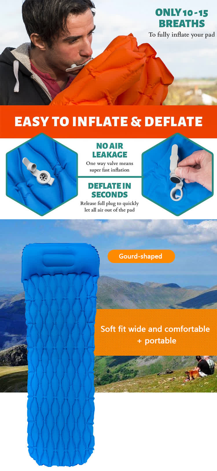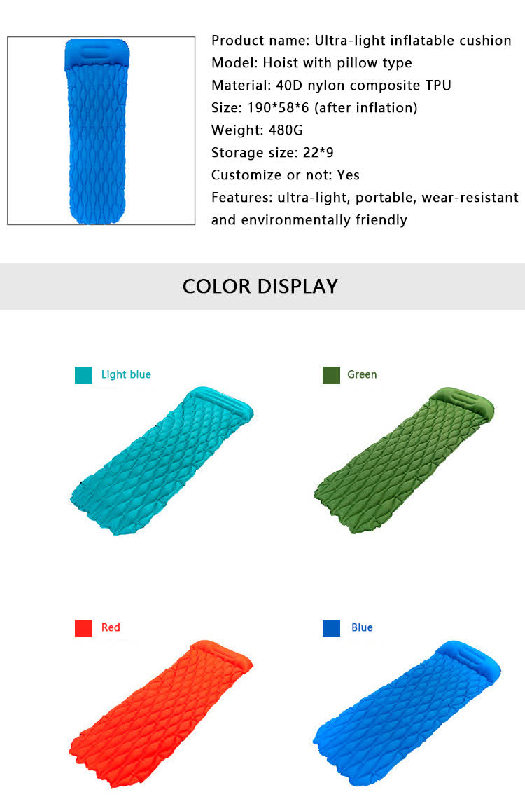 แบรนด์: โรงงาน ANHUI FEISTEL เกี่ยวข้องกับการผลิต: OEM และ ODM สินค้า:เสื่อนอนคู่แบบพกพาพร้อมหมอนเป่าลมในตัว พองตัวได้ง่าย น้ำหนักเบา กะทัดรัด เหมาะสำหรับการตั้งแคมป์ เดินป่า และแบกเป้