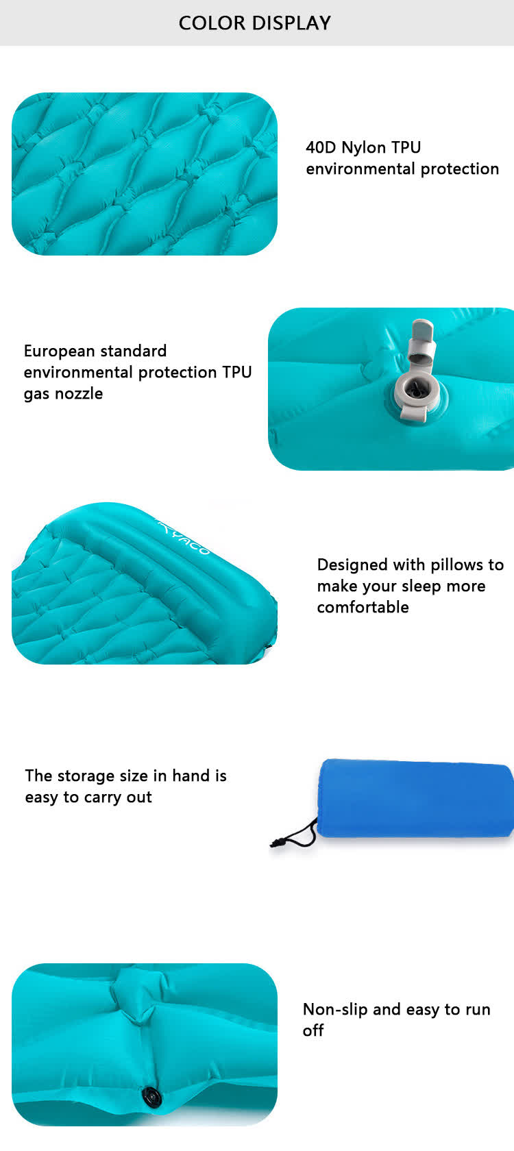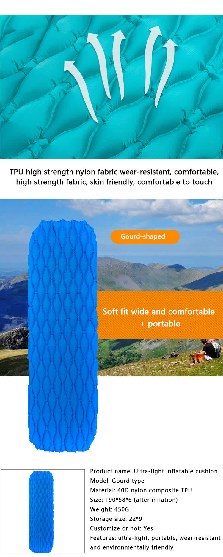 1.ผลิตจากวัสดุที่ทนทานและมีคุณภาพสูง -40D nylon เสื่อตั้งแคมป์ สำหรับกลางแจ้ง. 2. ทนทาน 2'' เสื่อตั้งแคมป์หนา มีความทนทานต่อการสึกหรอดีเยี่ยม.