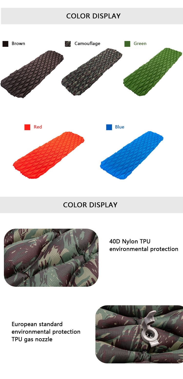 ด้วยวัสดุของ ไนลอน 40d , แผ่นรองนอนis ทนทานและ น้ำ- ต้านทาน .นอกจาก, the น้ำตา- ต้านทาน เสื่อตั้งแคมป์สามารถสำหรับ สภาพแวดล้อมกลางแจ้งที่รุนแรงที่หลากหลาย