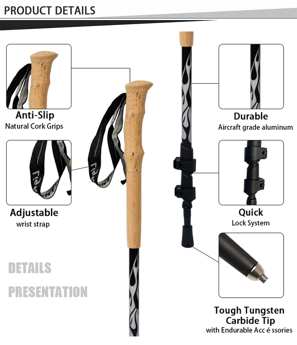 ผลิตภัณฑ์ : ไม้เท้าเดินป่าอลูมิเนียมน้ำหนักเบาพิเศษ 90% สำหรับขายส่ง มีดีไซน์แบบยืดหดได้ ด้ามจับทำจากไม้ก๊อก ตัวล็อคแบบสะบัด และความมั่นคงที่เชื่อถือได้ เหมาะสำหรับการเดินแบบนอร์ดิก การเดินป่า และการผจญภัยกลางแจ้ง